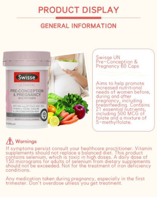Elevit pregnancy multivitamin (100) $58.95: Supports general health before pregnancy. Find the swisse bottle with the benefits you're after, follow the directions only as indicated, and let swisse be a helping hand to a healthier you! Find helpful customer reviews and review ratings for swisse premium ultinatal preconception & prenatal multivitamin | supports fertility, pregnancy, & breastfeeding | folic acid, omega 3 dha & epa, iodine, choline, vitamin c, d, & b, iron | 60 softgels at amazon.com. More than a prenatal multivitamin: